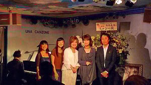 07日 10月 2012 10/5(金)後藤啓子・松本淳子・花木さち子・高橋良吉・しろき歌織 26周年記念最終日、本当に沢山のお客様にお越し頂きまして、スタッフ一同心から感謝いたします。 久しぶりにステージに立たれた後藤啓子さんの素敵な詩と音楽の世界にたっぷりと引き込まれました!松本淳子さん,花木さち子さんと素晴らしい歌声を聴かせて下さいました! 明日から27周年向けて出発! どんな素敵なステージを御提供していけるかワクワクします!これからもどうぞウナカンツォーネを宜しくお願い致します!By:亜弓 しろき歌織さん オーナー高橋良吉 花木さち子さん 松本淳子さん 後藤啓子さん tagPlaceholderカテゴリ: 12年10月